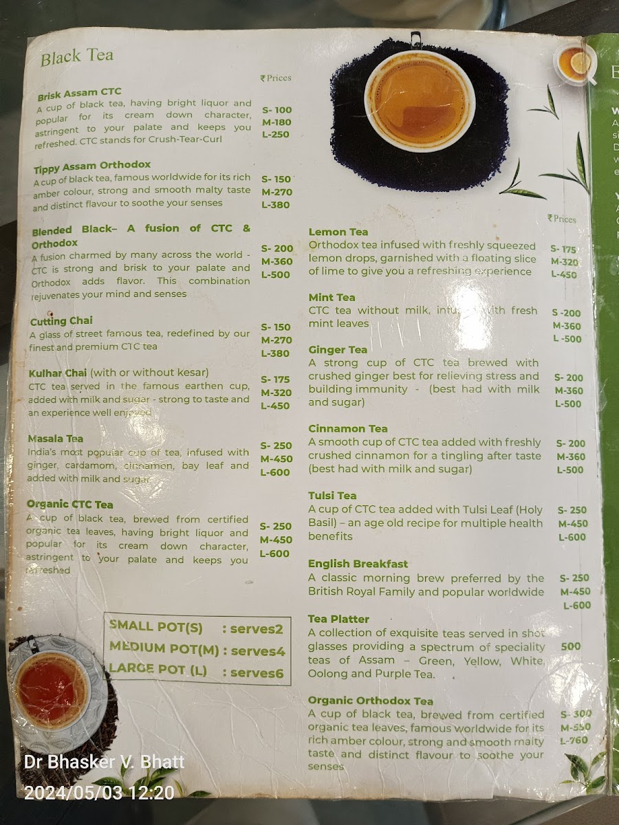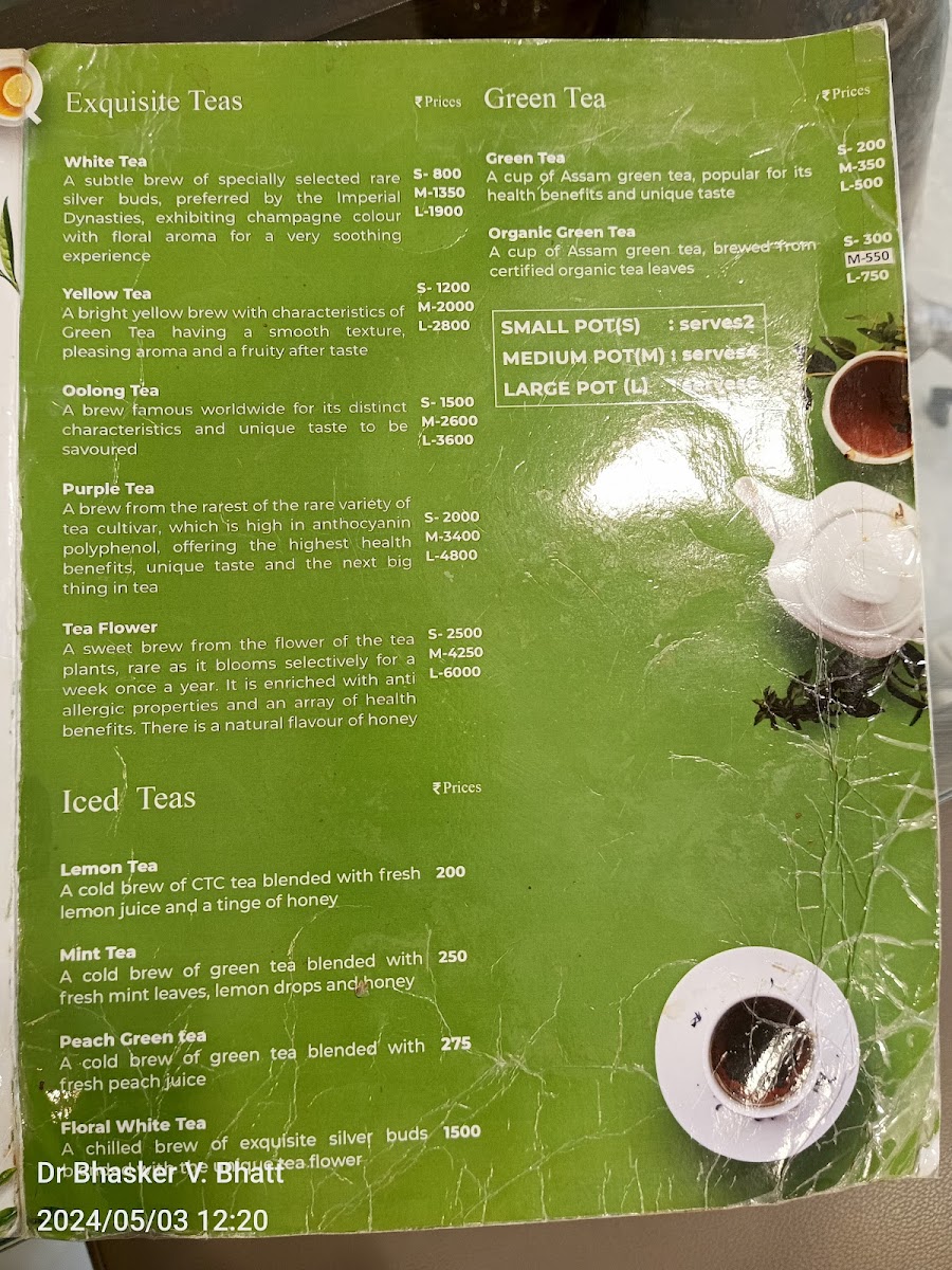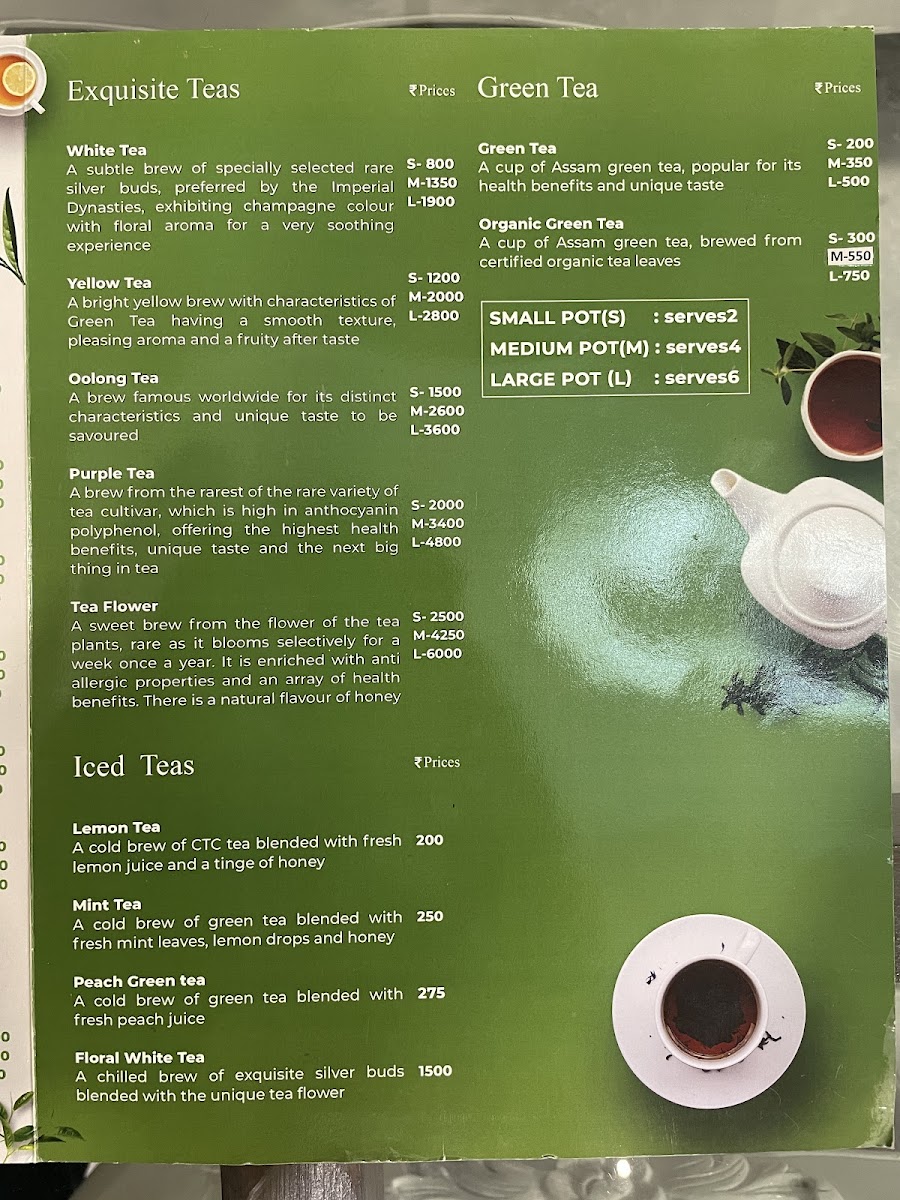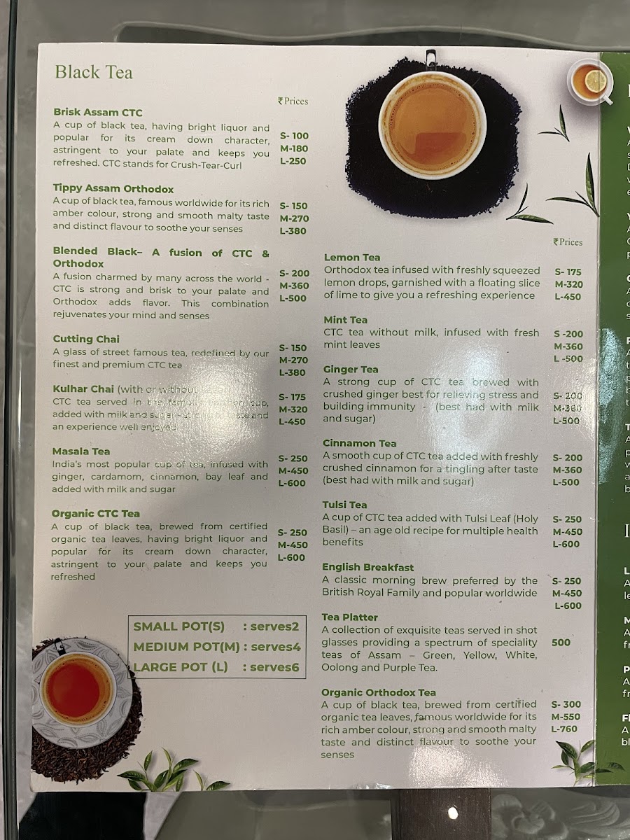 The menu at THE GTAC TEA LOUNGE offers a diverse selection of teas alongside a variety of snacks and light meals. The beverage options focus primarily on different styles and flavors of tea, including classic Assam Black Tea, Green Tea, White Tea, Yellow Tea, Oolong Tea, Purple Tea, and specialty preparations such as Masala Tea, Kulhar Chai, Cutting Chai, Tea Flower, and Organic CTC Tea. Both hot and iced tea selections are available, catering to various preferences and occasions.